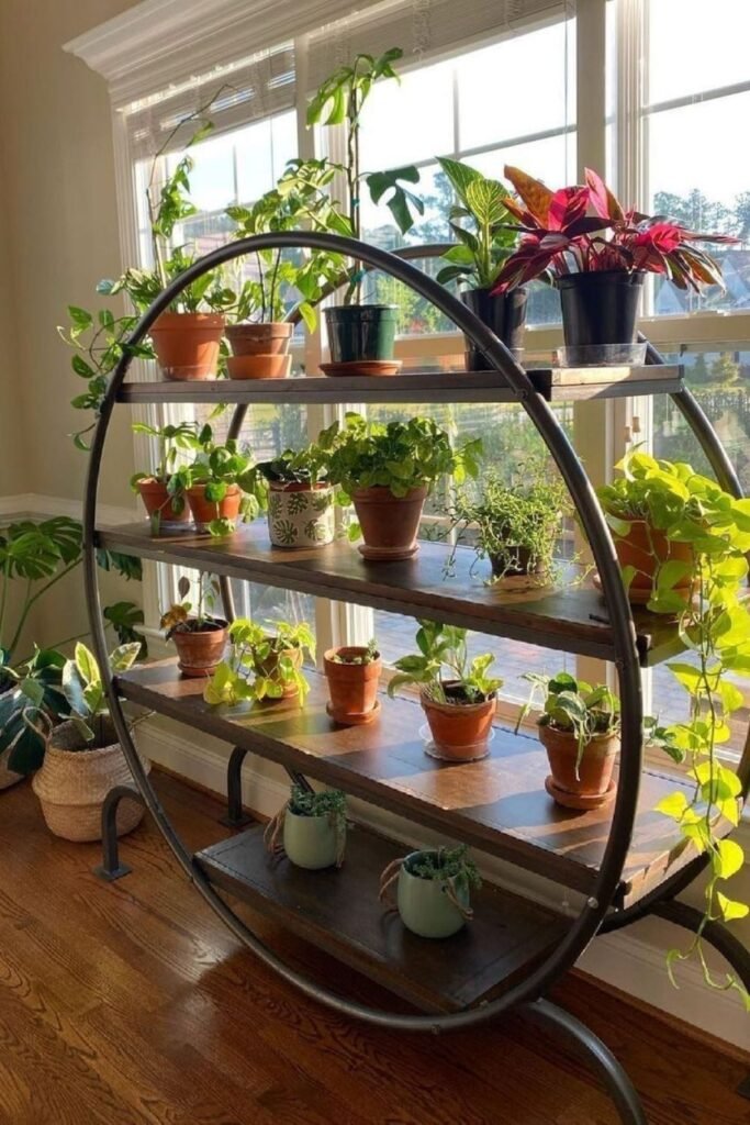 Natural light becomes predictable when shelves rise with the window. Tiered plant stands like this let you match plant height to light strength.