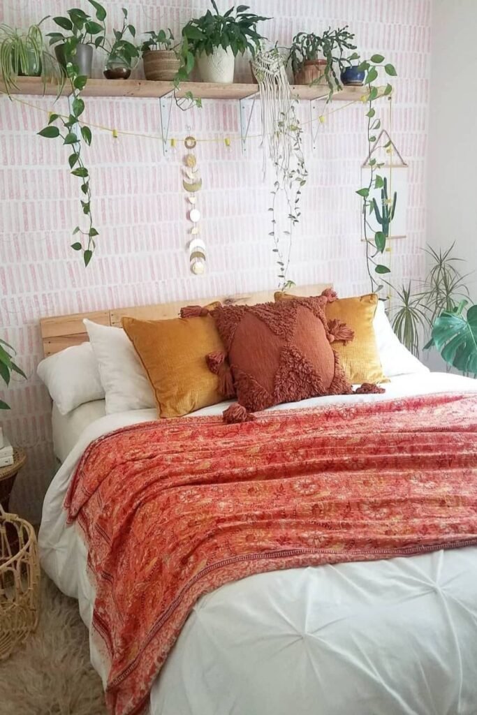 Bedrooms stay calmer when plants grow gently instead of demanding attention. Shelves placed above the headboard work best with trailing.