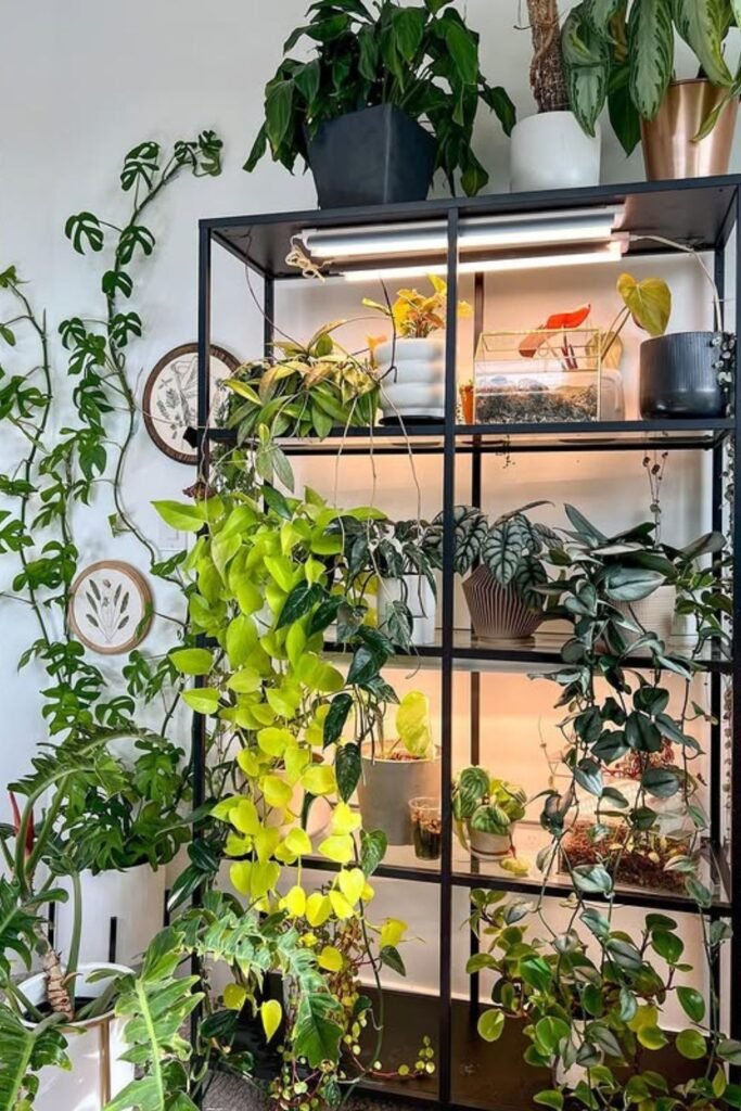 Structure helps mixed plants stay healthy instead of fighting each other. Open cube shelves like these give each plant its own light pocket.