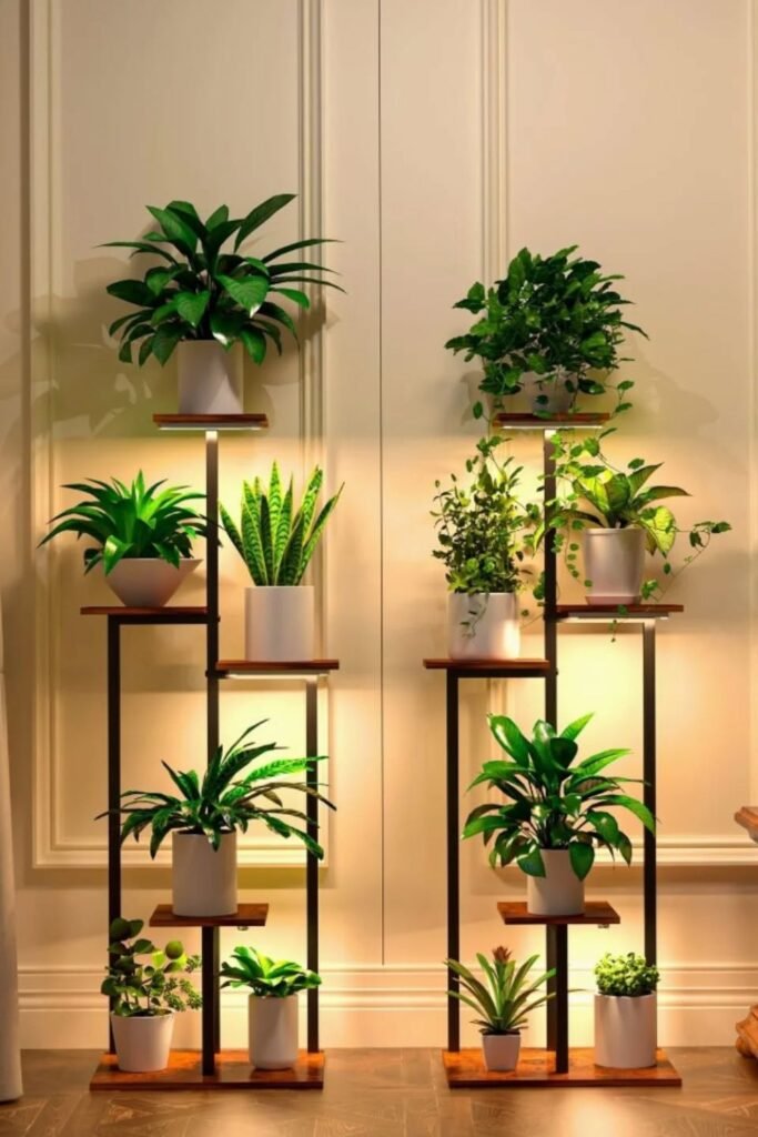 To recreate it, choose one tall stand and one slightly shorter one, then stagger plant heights so leaves don’t overlap.