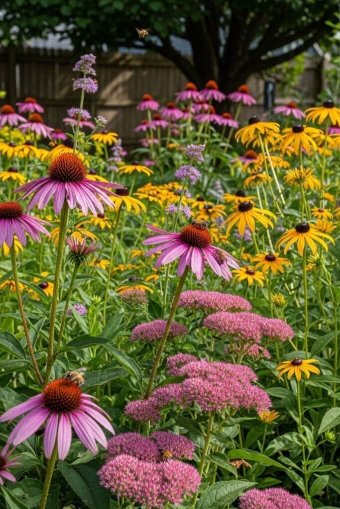 I grouped plants close together so pollinators don’t waste energy searching. This setup works great if your yard gets sunlight early but turns shady later.