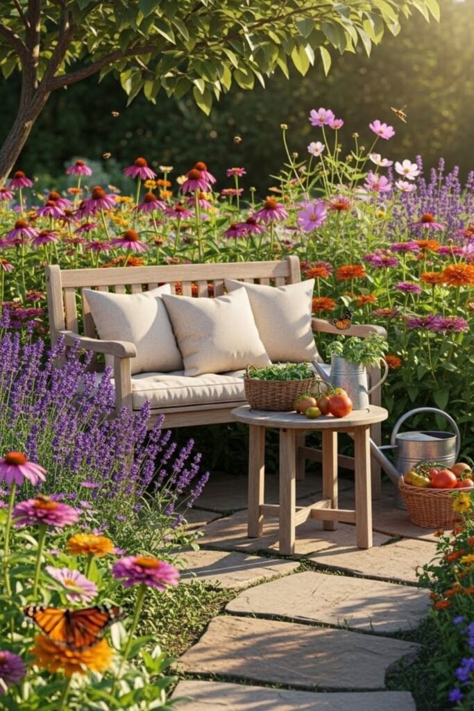 If you enjoy watching nature, seating belongs inside the garden. This idea turns observation into habit and makes gardening feel rewarding.