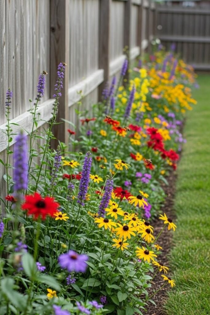Running out of wide space pushed me to think vertically. I planted along the fence so flowers grow where nothing else fits. Pollinators naturally follow lines.