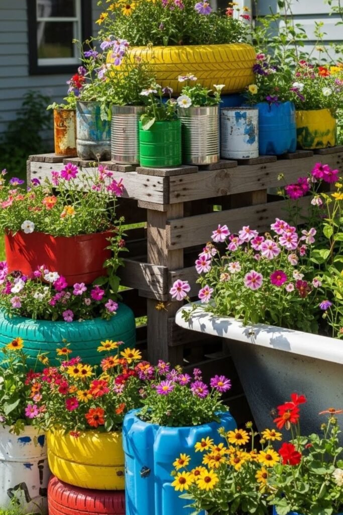 Saving old containers pushed me toward a more creative setup. I reused buckets, bowls, and tubs to grow pollinator plants instead of buying new pots.