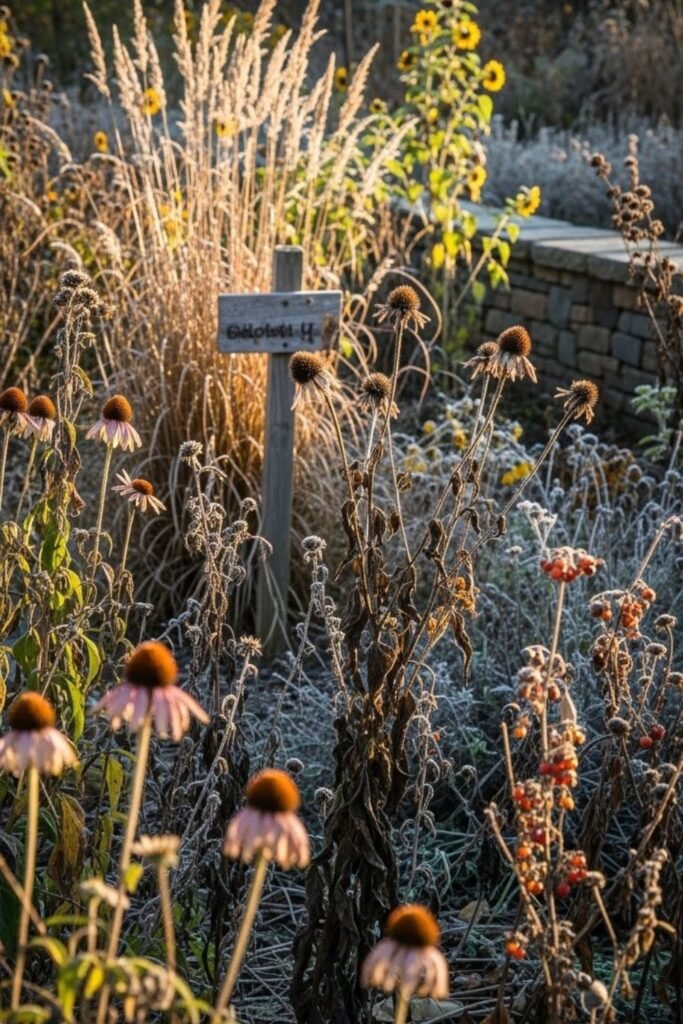 Stems, seed heads, and dried forms keep the area interesting while still supporting insects earlier in the year when growth returns.