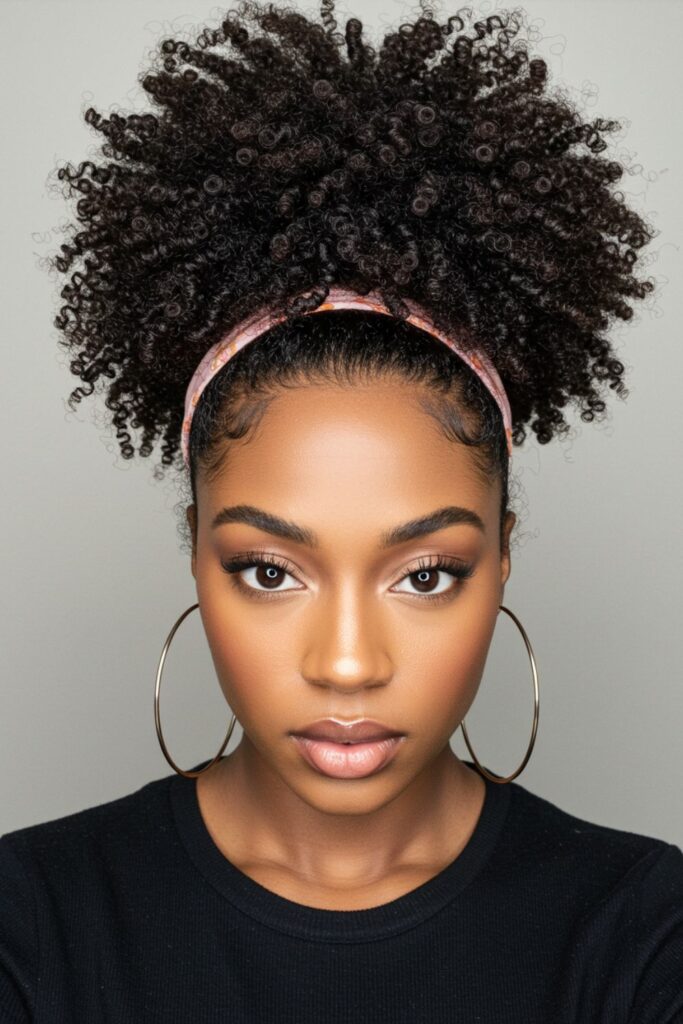 Rock a natural high puff that’s both chic and effortless. Use a brush to gather your textured curls into a high puff, securing with a band.