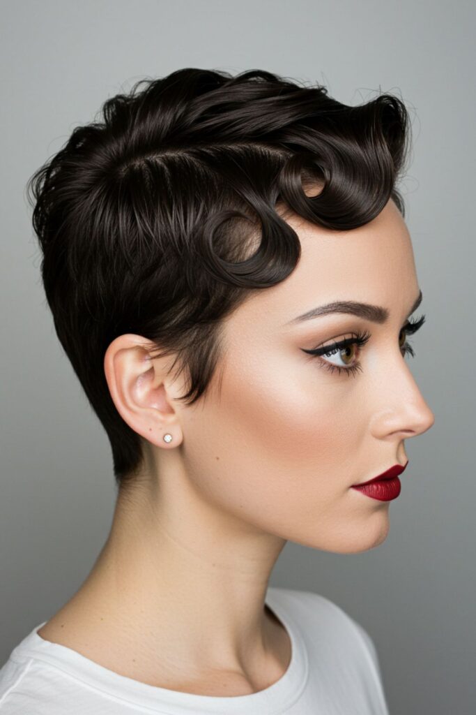Transform your look with a short, sleek pixie cut paired with retro finger waves.