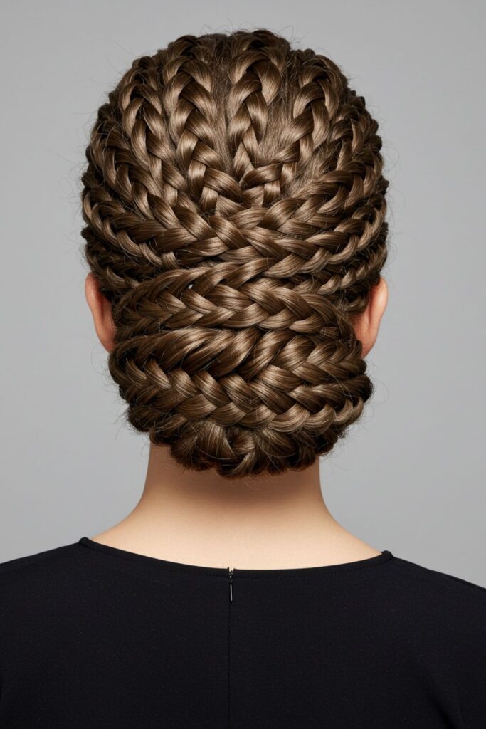 Flat twists or cornrows are carefully arranged to frame your face like a crown, leading into a graceful bun or cascading curls.