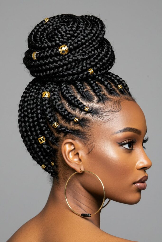 Start with intricate braids adorned with beads or rings, then gather them into a sleek high or low bun.
