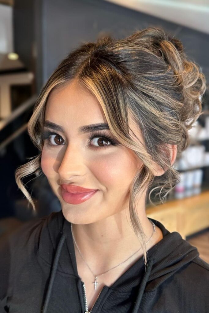 A high-volume messy bun with loose curls gives a dreamy, glamorous aesthetic.