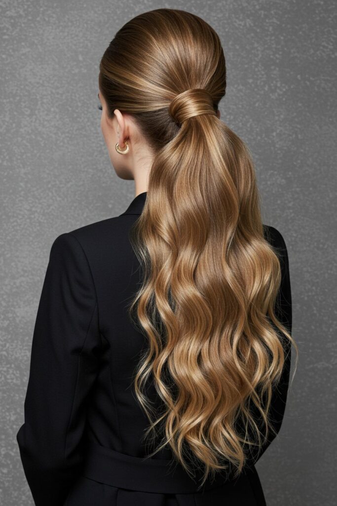Elevate your style with a long, wavy high ponytail that exudes glamour.