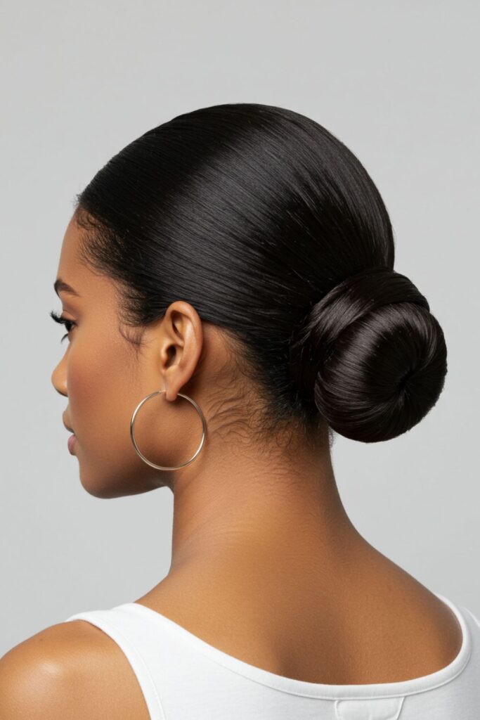 The sleek hairline and laid edges contrast beautifully with the volume of the bun, making it a perfect statement style.