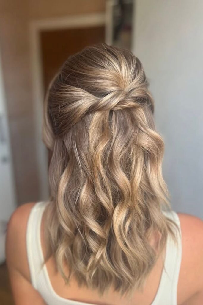 A half-up, half-down twisted style brings together the best of soft waves and effortless structure.