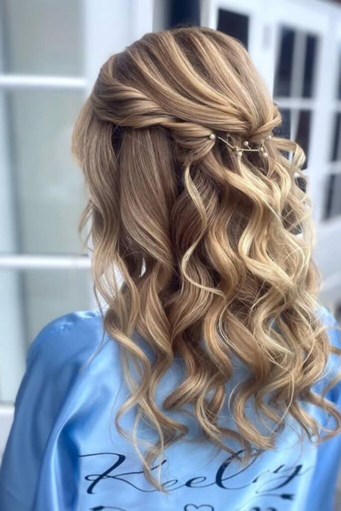 A soft half-up, half-down style with twisted detailing creates a dreamy, romantic vibe.