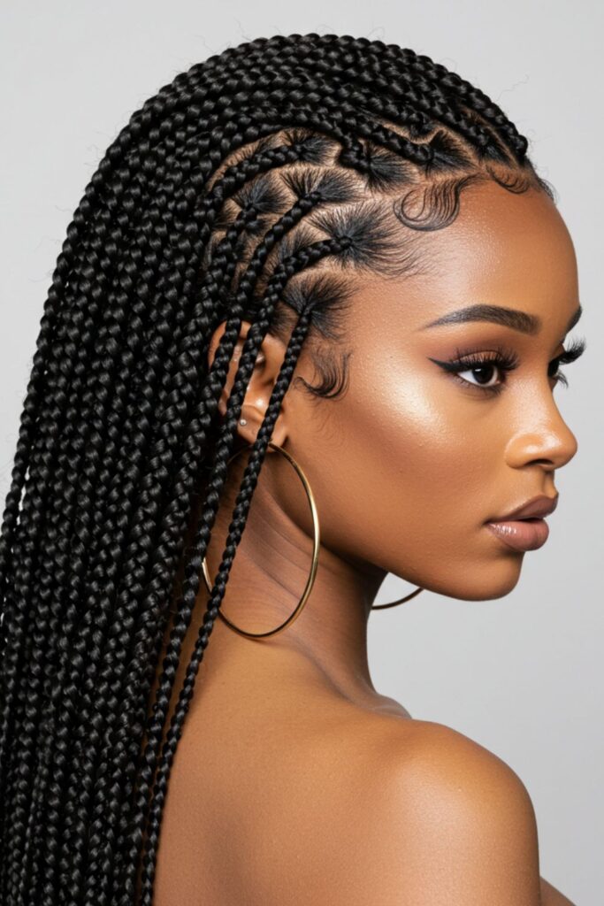 Create a stunning fusion of culture and elegance with Fulani braids styled into a bun.