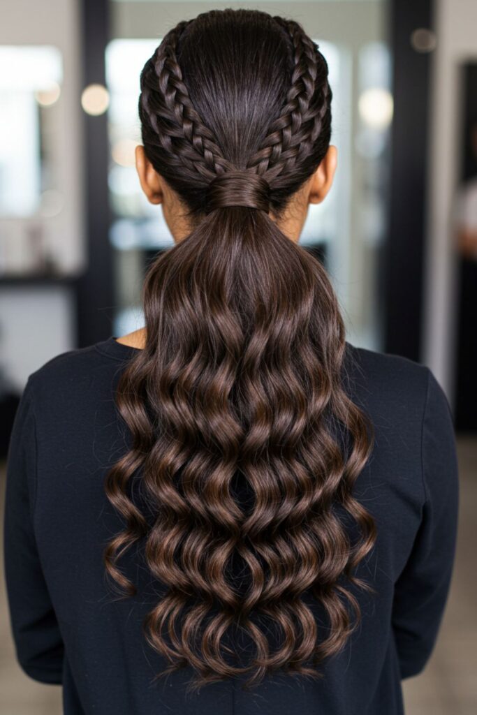 Elevate your style with a sleek braided ponytail that flows into cascading curls.