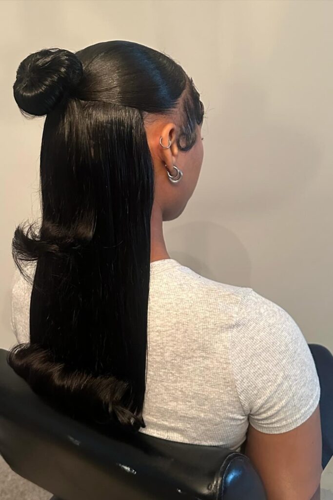 Sleek Ponytail features a polished, long tail with a neatly wrapped base, providing a streamlined and sophisticated appearance.