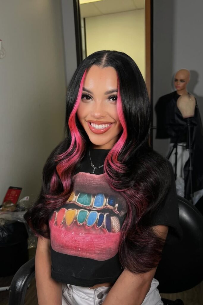 Vibrant Streaks offers a playful yet sophisticated hairstyle with bold pink highlights over deep black waves.