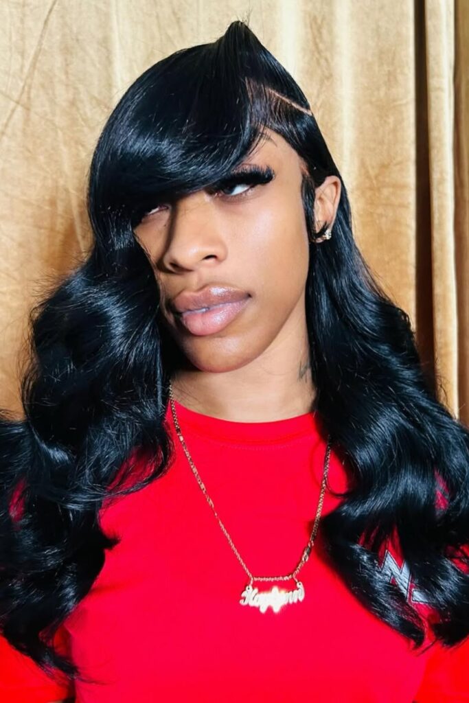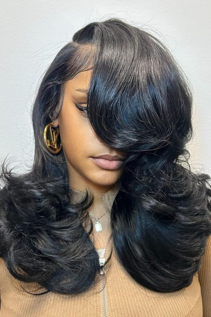 This hairstyle is all about drama and movement, ideal for making a bold fashion statement while maintaining a sleek, styled look.