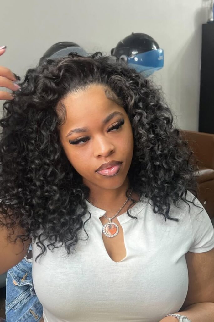 Glamorous Waves feature deep, cascading curls with a glossy finish that enhance the hair’s natural luster.