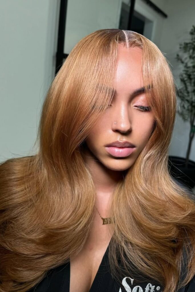 This hairstyle is ideal for adding a warm, inviting tone to your look, suitable for those looking to brighten their style with a playful yet polished appearance.