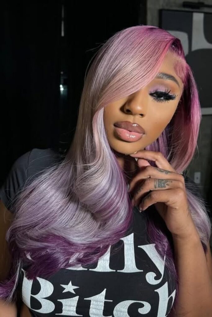 Lavender Dream features a stunning blend of soft lavender and pink hues, styled in long, luxurious waves.