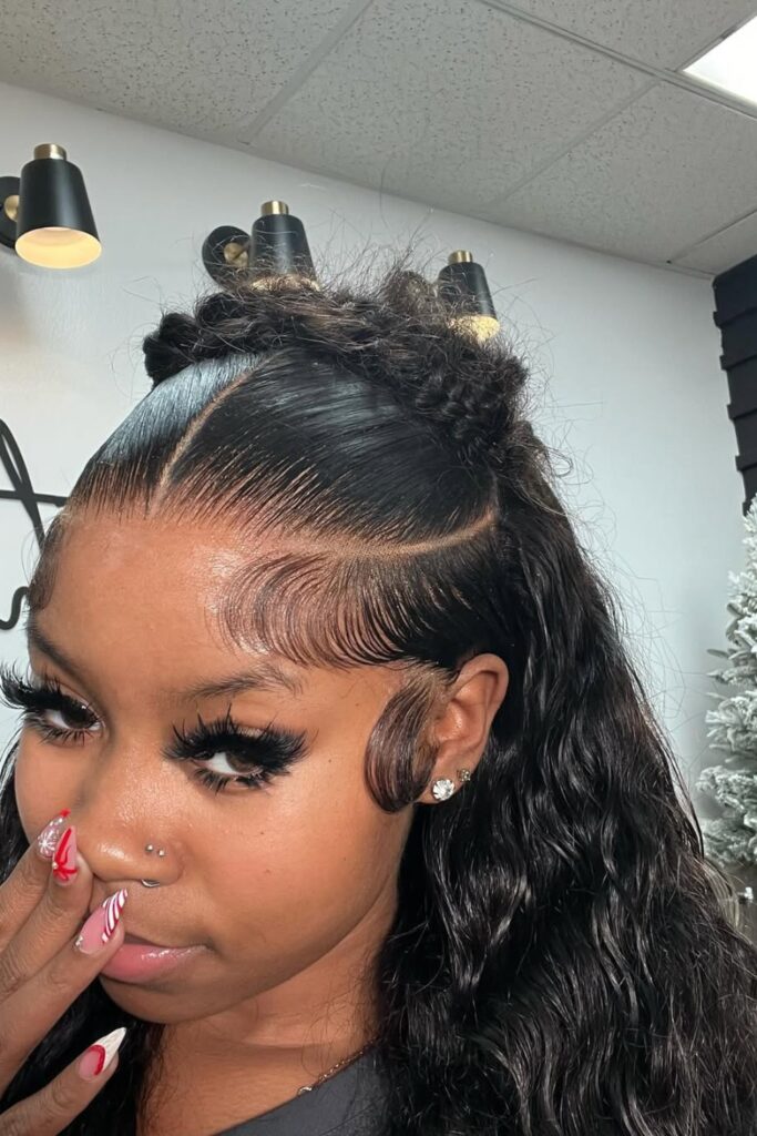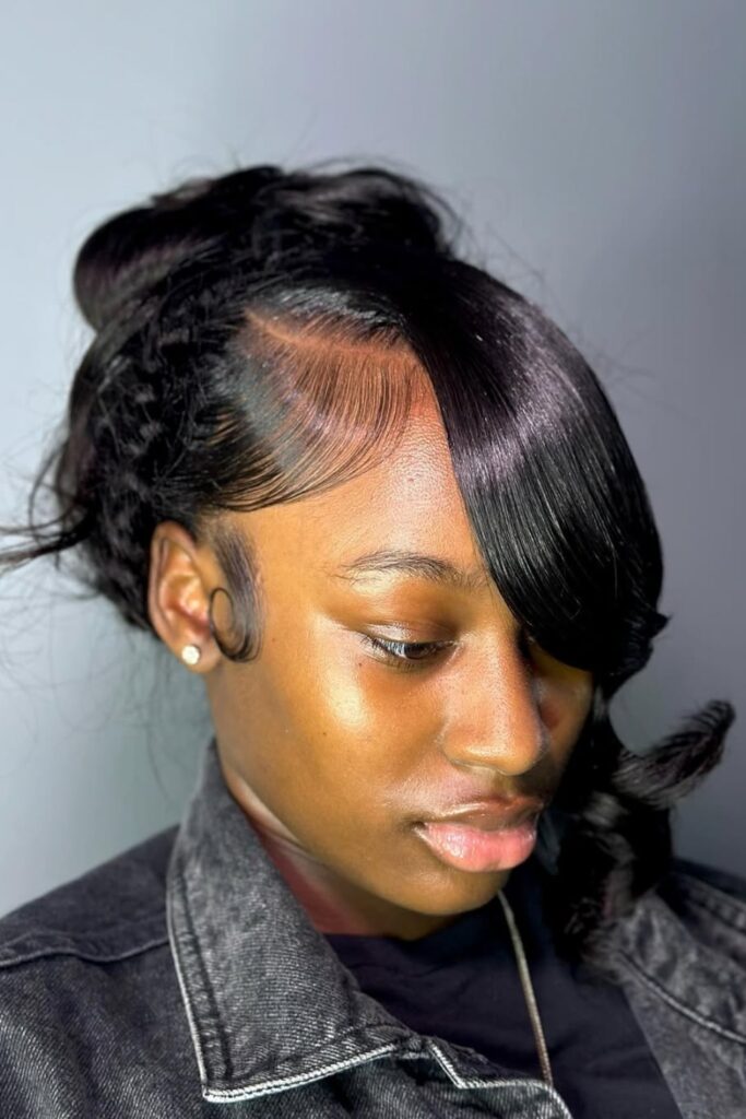 This hairstyle blends traditional styling with modern artistry, ideal for those who appreciate a sophisticated yet eye-catching appearance.