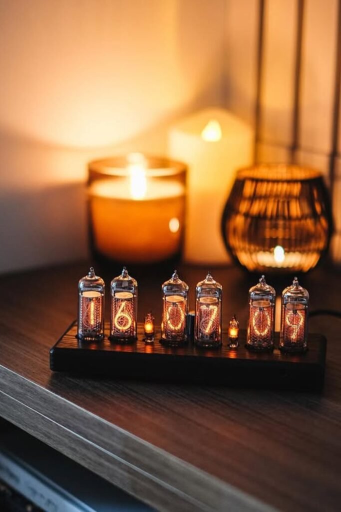 Recreating this look means choosing a modern Nixie-style clock or a safe replica that uses LED tubes instead of original high-voltage components.