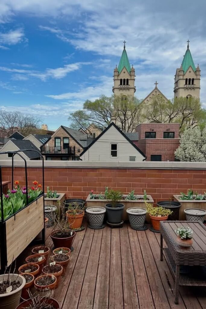 Consistency makes small rooftops feel organized instead of cluttered. Matching pots lined along the railing create a clean green border while keeping everything lightweight and movable.