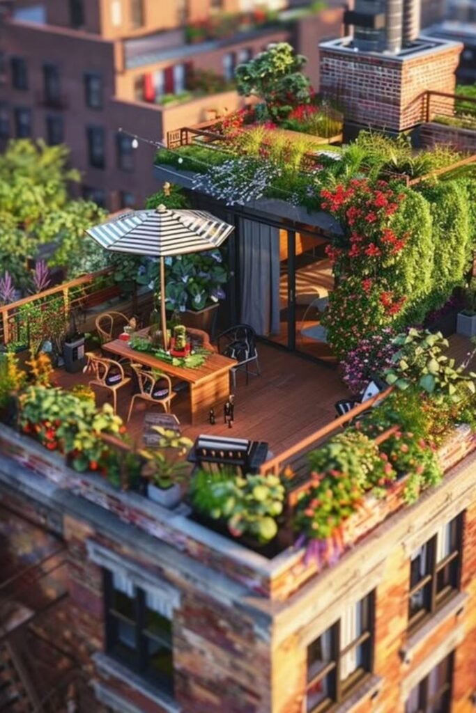 And even rooftops above create a self-contained garden feel. This setup fits larger rooftops meant for daily use.