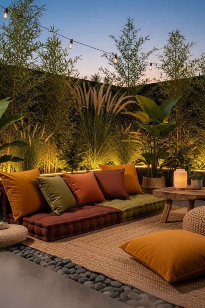 Night changes how a garden feels, so I design with low light in mind. I place soft lights close to where I sit instead of lighting the whole space.
