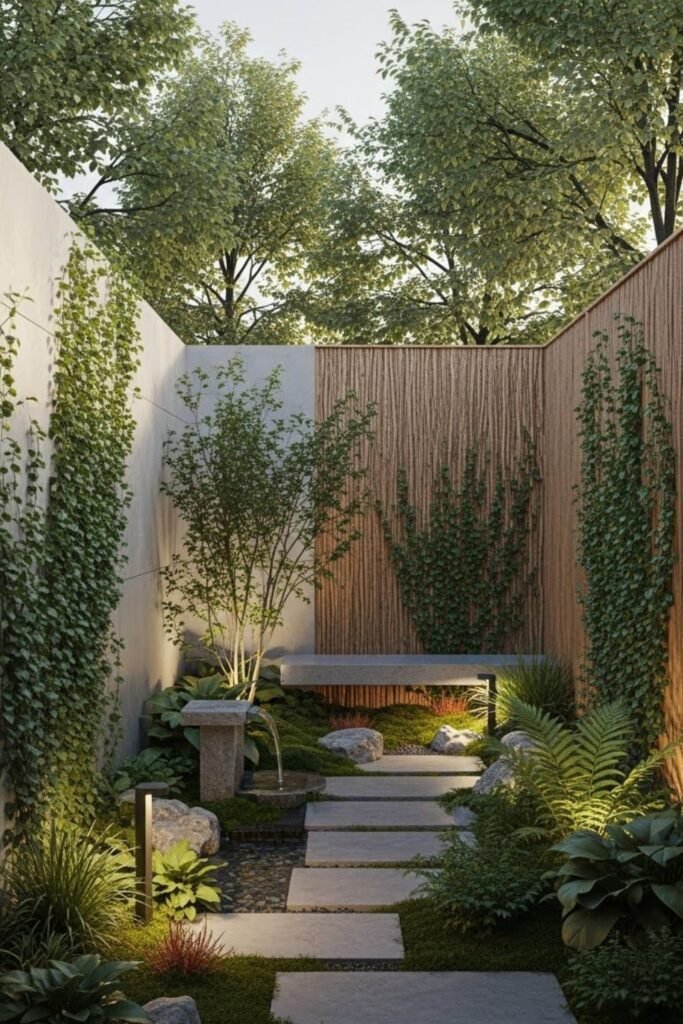 I keep the floor simple so the wall stays dominant. This works well in tight spaces because vertical growth creates privacy without stealing walking room.