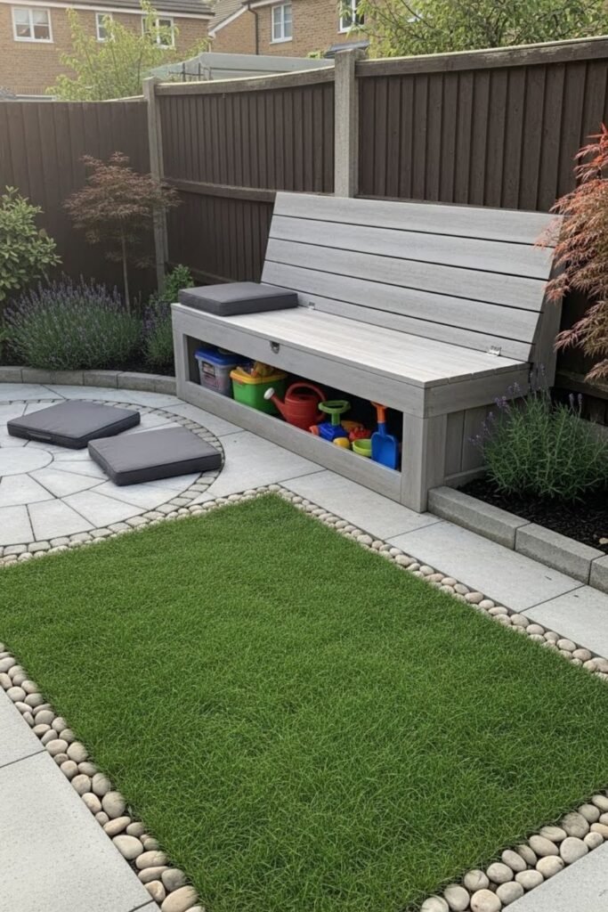 I use benches instead of chairs so everything has a place to disappear when not in use. Cushions lift up, toys slide inside, and the garden looks tidy without effort.