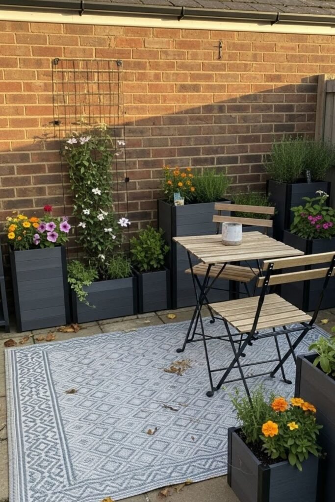 I keep furniture compact and place it where the garden feels widest. Extra pots, side tables, and decorations only steal breathing room.