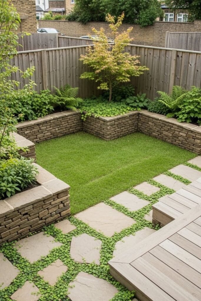 Grass demands time that small gardens rarely deserve, so I remove it completely. Hard surfaces like paving or decking keep the area clean and usable year round.