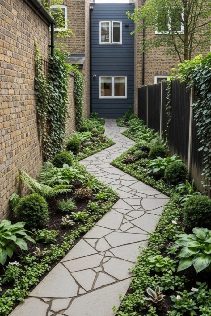 Straight lines make narrow gardens feel boxed in, so I like changing the direction your eyes move. I place stepping stones or paving at a slight diagonal instead of running them straight back.