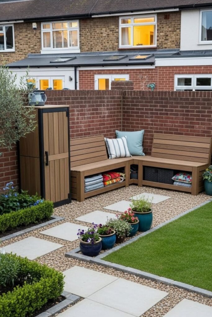 Storage mistakes quickly overwhelm small back gardens, so I plan hiding places from day one. I use benches, tall cabinets, and vertical hooks to lift clutter off the floor.
