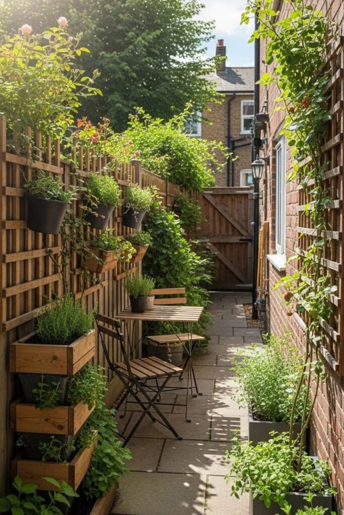 Walls are the most ignored asset in small gardens, so I use them first. Vertical planters, wall hooks, and slim trellises lift greenery off the ground.