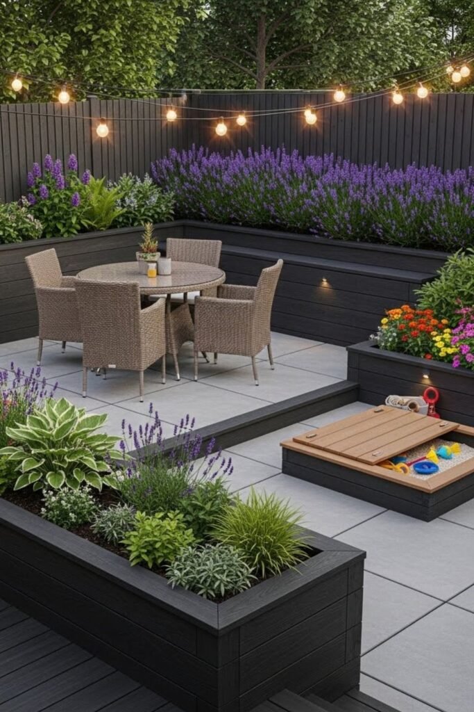 I soften the look with planters instead of lawns. Shoes stay clean, toys move easily, and maintenance drops fast. Without mowing or muddy patches, the garden works every day.