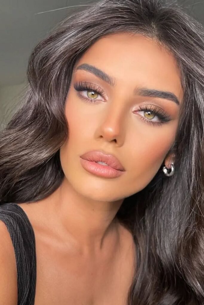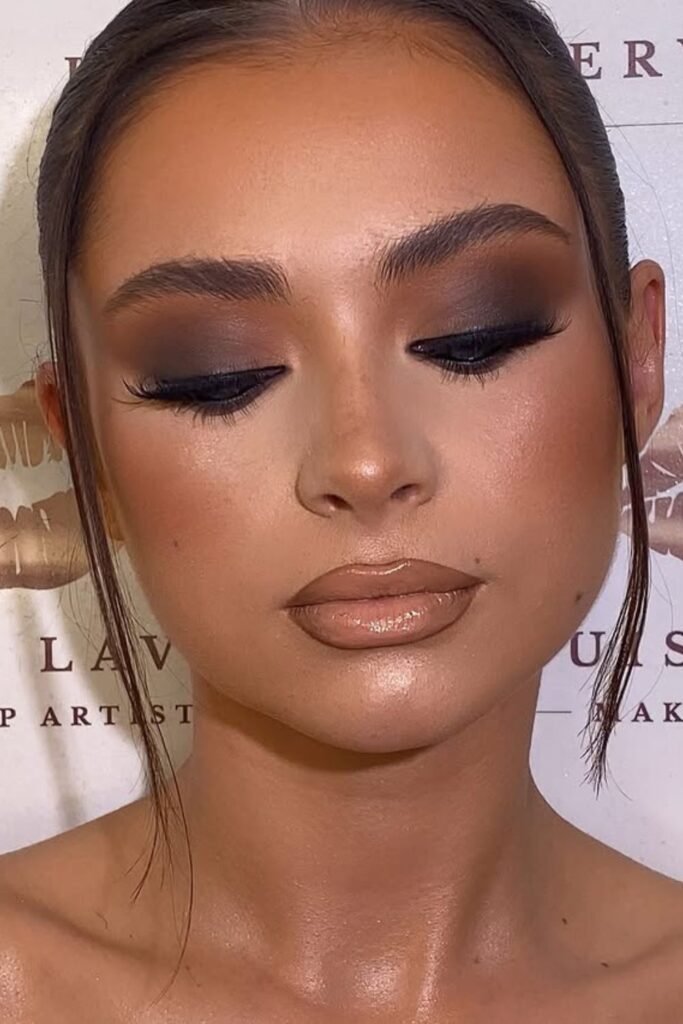 This look uses light nude and taupe colors blended gently over your eyelids for a clean and classy style.