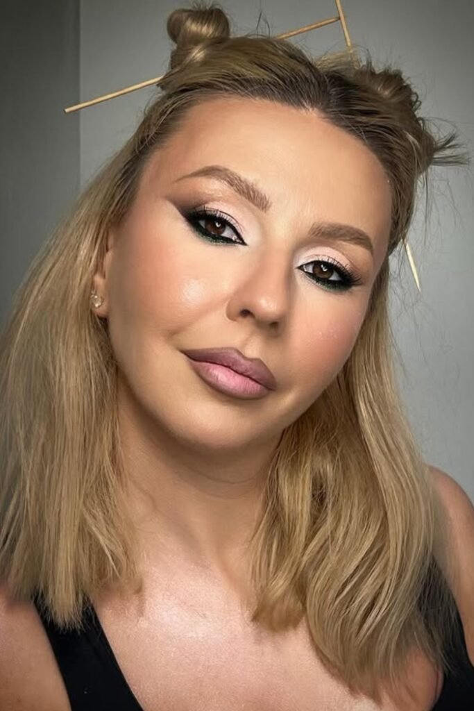 This bold look layers deep green eyeshadow with black edges, creating a striking effect that makes hazel or green eyes stand out.