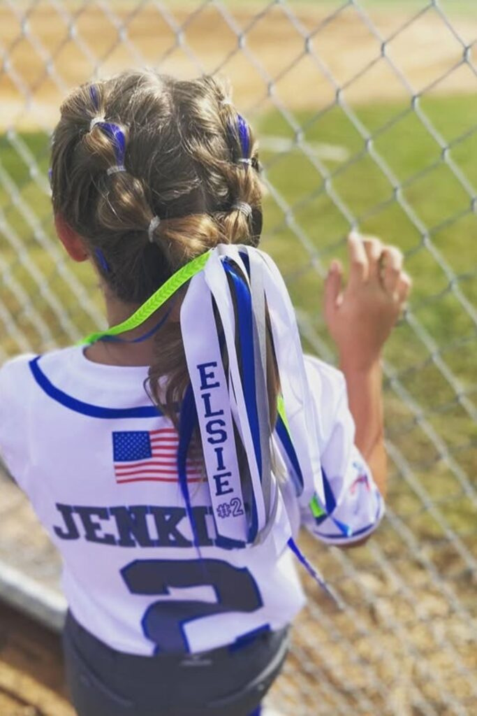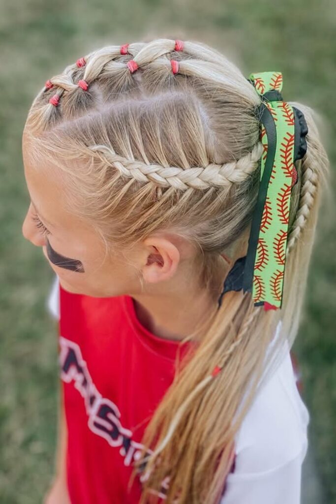 A great way to show team spirit while keeping hair secure, this look is ideal for players who want to sport a personalized yet practical softball hairstyle.