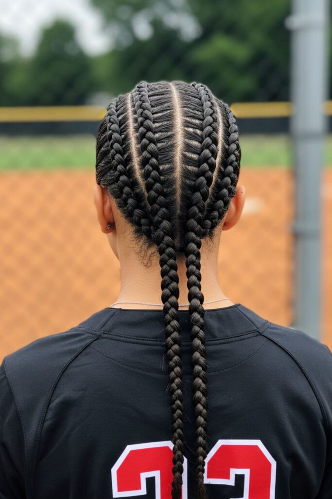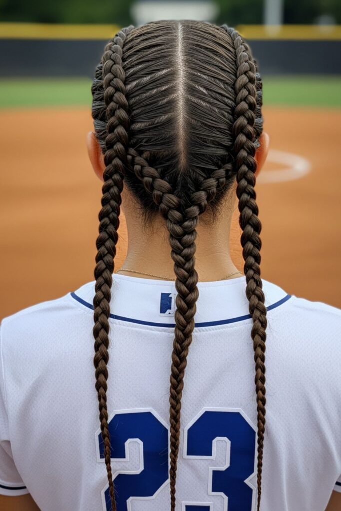 A softball classic, these double Dutch braids provide maximum hold and comfort throughout the game.