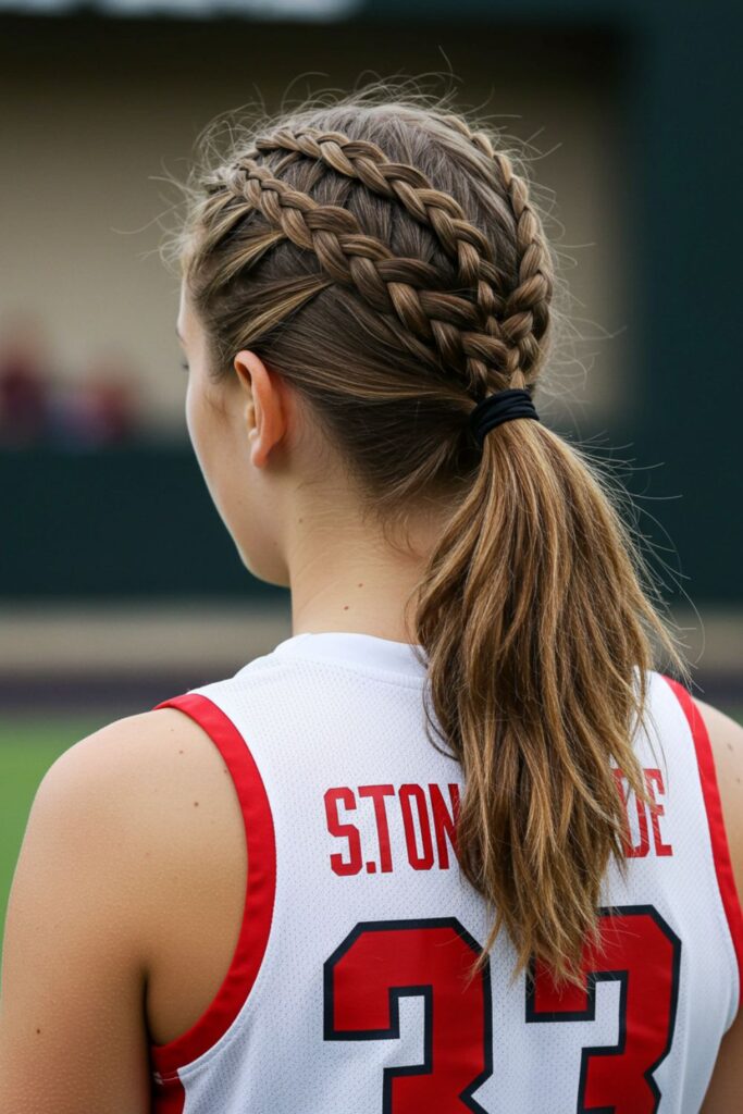 The braid adds a sporty, textured look, while the ponytail allows for easy movement.