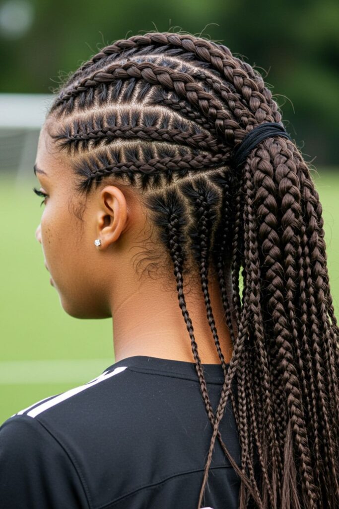 Perfect for young athletes looking to stand out on the field, this hairstyle is secure, stylish, and sweat-proof, ensuring the hair stays put during intense gameplay while making a bold statement.