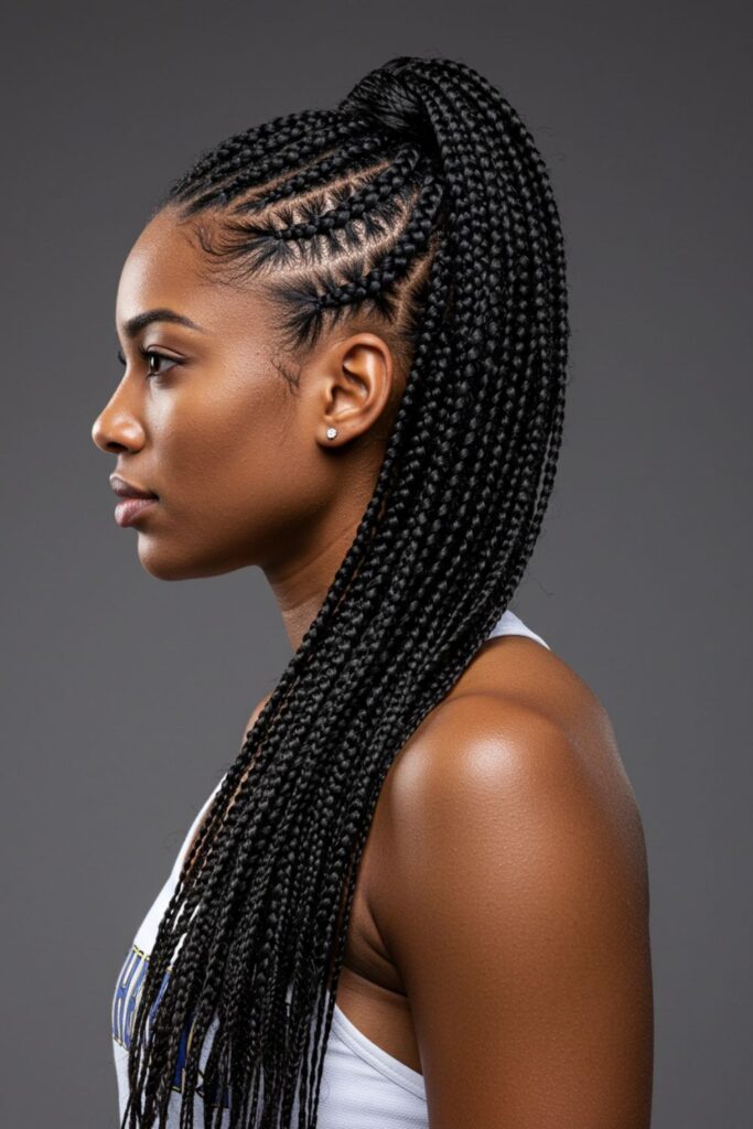This style features small, scalp-hugging braids that flow into a high or mid ponytail, ensuring a snug and stylish finish.