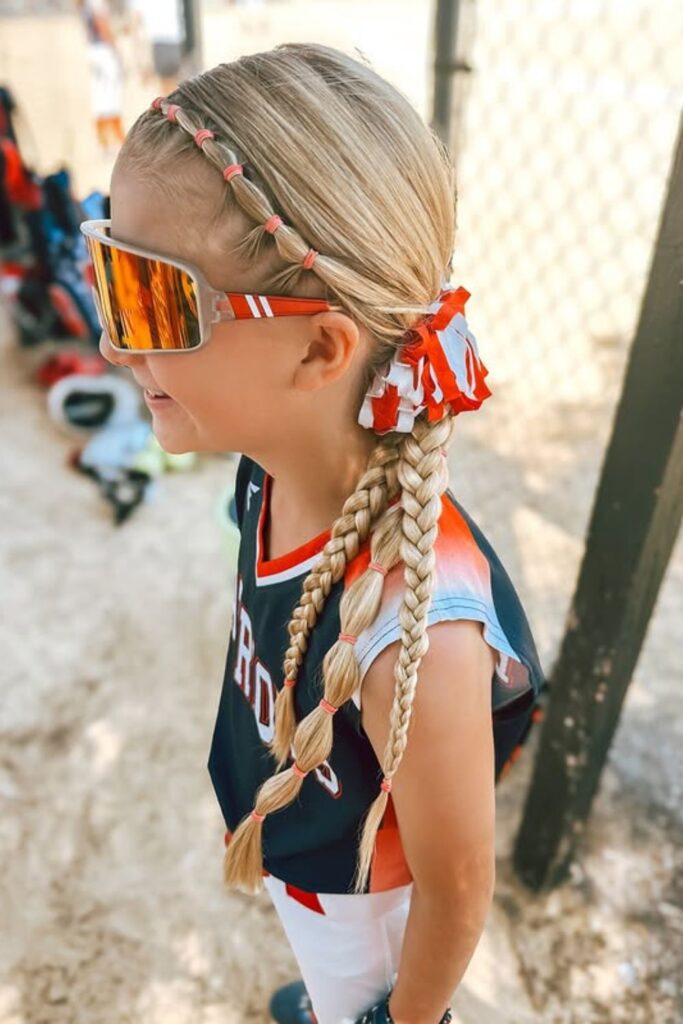 This style features two simple ponytails or braids, tied off with colorful ribbons that match your team’s colors.