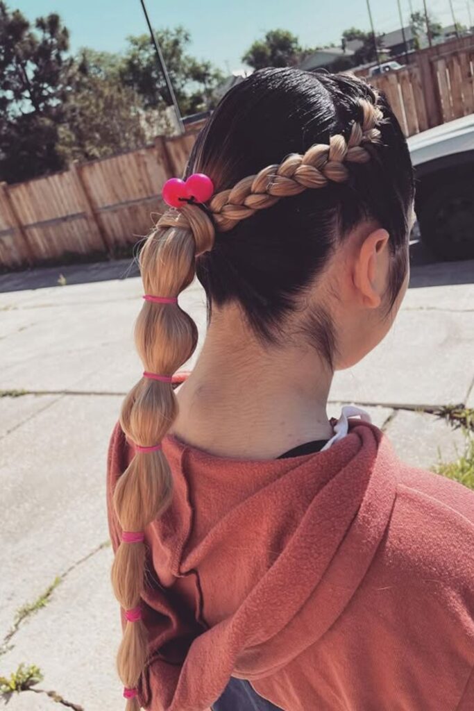 This modern take on the bubble ponytail features a sleek side braid that wraps around the head, merging into a bubble ponytail with vibrant elastics.