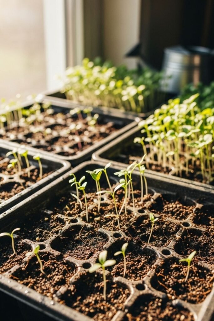 Trays near windows work fine. Thinning seedlings strengthens survivors. Losses hurt less when costs stay low.