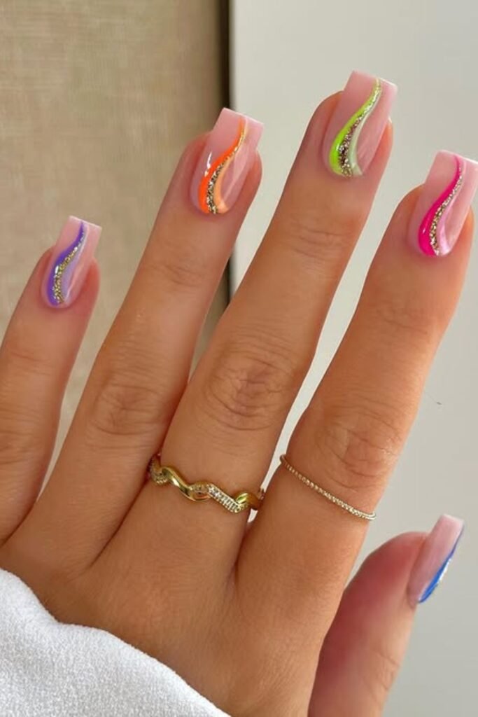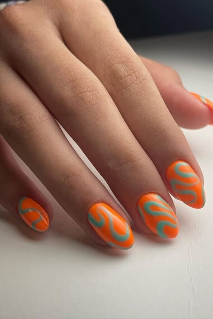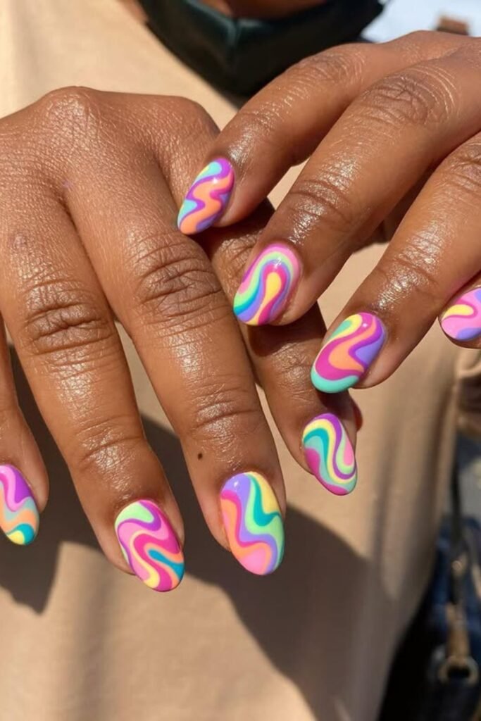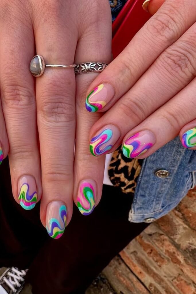 Bright colors work well when you want nails that stand out instantly, and this set shows how far you can push a swirl design without losing balance.